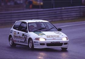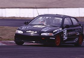 1994年11月 95年を見据えてマシンを新しく製作し、参戦3年目の締めくくりレースとして最終戦SUGOに臨んだ。ニューマシンは練習から調子良く、決勝ではCADET三幸社シビックとのバトルを制して、初の表彰台を「優勝」でゲットした。スタッフの歓びの表情の後ろに「P1」のサインボードが見える。 |